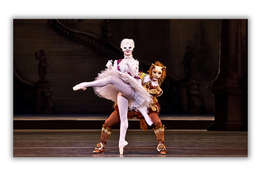 To quote the great 20th-century choreographer George Balanchine: “Puss in Boots tries to ensnare the winsome cat in a love trap. The White Cat pretends to resist Puss’s caresses; but actually she is delighted. Finally Puss can contain himself no longer and puts an end to the flirtation by carrying his ladylove offstage.”